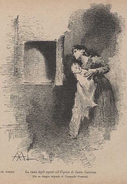 From about the thirteenth century through the end of the nineteenth century, throughout the areas that in 1860 became unified Italy, a pregnant single woman, faced with the loss of her own and her family’s honor, would leave her residence to give birth elsewhere and after having the baby baptized, would give (or have the midwife give) the newborn baby to a foundling home (ospizio) to be cared for by others.